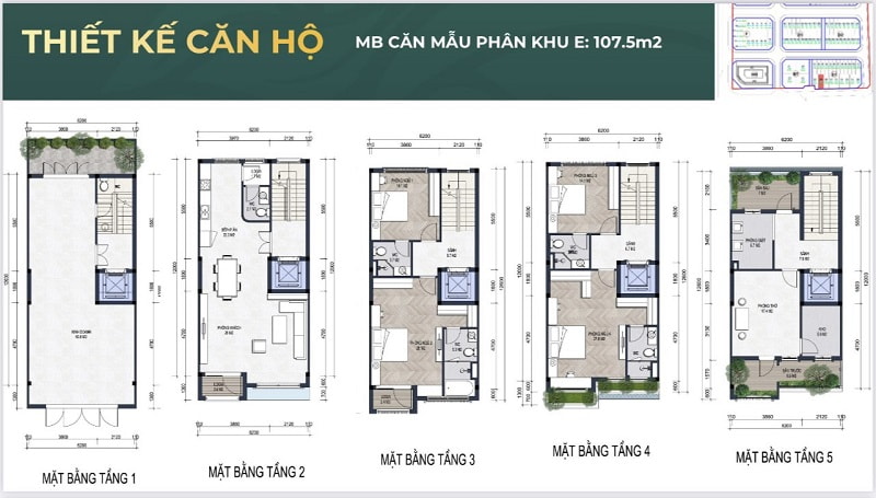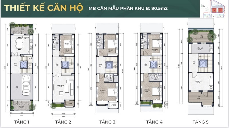 - Diện tích các căn: Từ 80 – 100 m²/căn